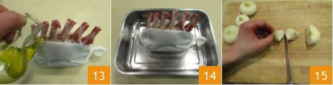Ajoutez un filet d'huile à l'intérieur du papier 13 et placez le tout dans un plat à four 14. Coupez les oignons grelots en 4 15 et insérez-les à côté.