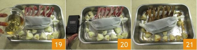 Versez ensuite la bière blonde dans le plat 19 et insérez la sonde qui servira à surveiller la température de la viande 20. Faites cuire au four préchauffé à 180°C pendant 36 minutes, jusqu'à ce que le cœur de la viande atteigne 60°C. Sortez ensuite l'agneau du four 21,