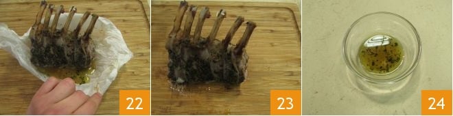 ouvrez le papier 22 et extrayez les côtes 23 en réservant le jus de cuisson 24.