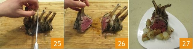 Coupez le carré 25 de manière à séparer les côtes 26. Servez ensuite votre carré d'agneau au thym et lard avec les oignons grelots, en arrosant le tout avec le jus de cuisson 27.