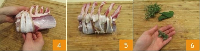 enveloppez les tranches de lard autour des différentes côtes (4-5). Si le lard ne colle pas, vous pouvez légèrement huiler la viande. Prenez ensuite les herbes aromatiques (thym, sauge et romarin) et effeuillez-les 6.