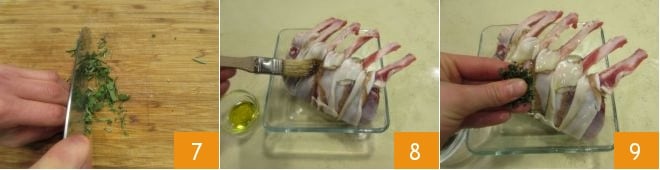 Avec un couteau, hachez-les finement 7. Ensuite, huilez votre carré 8 et saupoudrez-le avec le hachis fraîchement préparé 9, en exerçant une légère pression pour le faire adhérer ; poivrez à votre goût, il ne sera pas nécessaire de saler l'agneau puisque le lard est très savoureux.