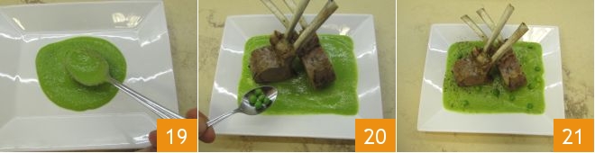 Il est temps de servir: prenez un plat de service et répartissez au fond la crème de petits pois 19, déposez dessus deux côtelettes (par personne) en les croisant si vous préférez pour une présentation plus soignée et garnissez avec les petits pois entiers que vous avez mis de côté 20. Dégustez immédiatement votre succulent carré d'agneau sur crème de petits pois 21.