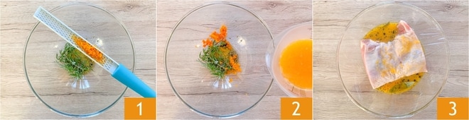 Pour réaliser le rôti à l'orange, commencez par prélever le zeste et le jus d'environ 1 kg d'oranges : vous aurez besoin de 10 g de zeste et 450 g de jus. Préparez la marinade : mettez dans un bol le romarin, le thym, le laurier, les grains de poivre et 2 cuillères à soupe d'huile prises de la dose totale, puis ajoutez le zeste râpé des oranges 1 et la moitié du jus pressé 2. Ajoutez la viande dans le bol, puis couvrez de film plastique et laissez mariner au réfrigérateur pendant au moins 3 heures 3. Toutes les 30 minutes, tournez la viande dans le bol pour vous assurer que tous les côtés soient en contact avec la marinade.