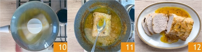 Couvrez avec un couvercle et faites cuire pendant 3 heures à feu moyen-doux 10, en retournant la viande de temps en temps et en la nappant avec le jus de cuisson 11. En fin de cuisson, ajustez le sel. Au moment de servir, coupez le rôti à l'orange en tranches et arrosez-le avec le jus de cuisson 12 !
