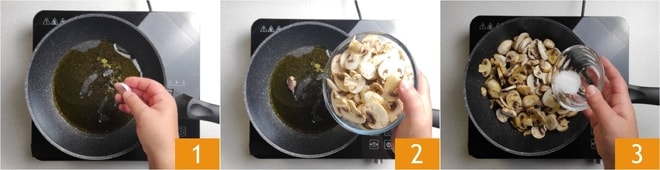 Pour préparer l'échine de porc à la poêle, commencez par nettoyer les champignons de Paris. Coupez la partie finale du pied, généralement terreuse, et enlevez la peau qui recouvre le chapeau. Nettoyez les champignons avec un torchon propre et humide pour éliminer les éventuels résidus de terre. Dans une poêle, versez 15 g d'huile pris du total, ajoutez une gousse d'ail en chemise et faites-la rissoler 1. Ajoutez les champignons 2 et assaisonnez de sel 3.