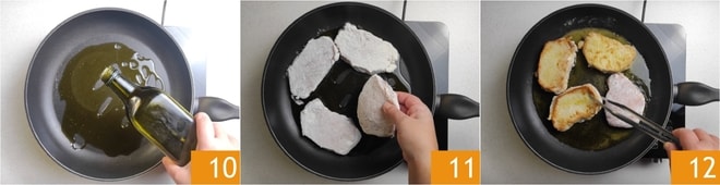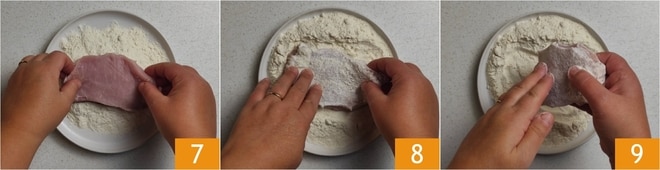 Passez les deux côtés des tranches dans la farine 7 8 et enlevez l'excédent 9.