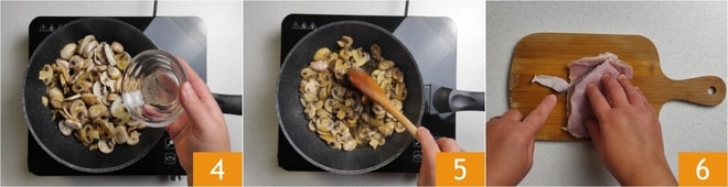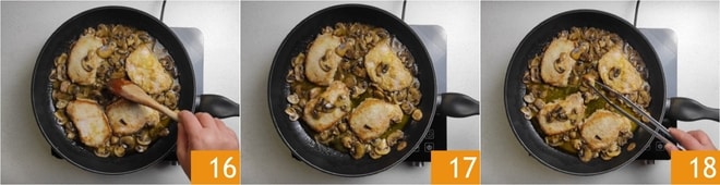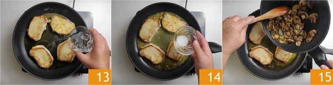 Déglacez avec du vin blanc 13 et laissez l'alcool s'évaporer. Ajustez le sel 14 et continuez la cuisson, à feu doux, pendant 10 minutes. Ajoutez ensuite les champignons avec tout leur fond de cuisson 15.
