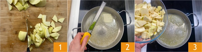 Pour préparer les carrés de pâte feuilletée aux pommes, commencez par préparer les pommes. Éliminez le trognon et coupez-les en tranches assez fines 1. Dans une casserole, faites fondre le beurre puis ajoutez le zeste de citron vert 2 et les pommes 3.
