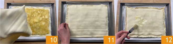 Recouvrez d'une seconde pâte feuilletée 10 et scellez bien les bords 11. Badigeonnez de beurre fondu 12.
