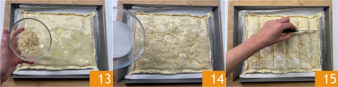 Saupoudrez la surface d'abord avec les amandes effilées 13 puis avec le sucre 14. À l'aide d'un couteau, en exerçant une pression suffisante pour inciser la pâte supérieure et la garniture mais pas la pâte inférieure, faites des lignes sur la surface de la pâte : 4 sur le côté court et 6 sur le côté long 15. De cette façon, vous formerez les carrés.