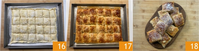 Une fois cette opération terminée 16, faites cuire au four statique à 180°C pendant 35-40 minutes 17. Pour un parfait dorage, vérifiez, pendant les dernières minutes, que le sucre est caramélisé ; si ce n'est pas le cas, placez la plaque sur le niveau supérieur du four et poursuivez la cuisson encore quelques minutes. Sortez du four et laissez tiédir. Séparez les carrés, à la main ou avec un couteau, et saupoudrez de sucre glace. Vos carrés de pâte feuilletée aux pommes sont prêts à être dégustés 18.