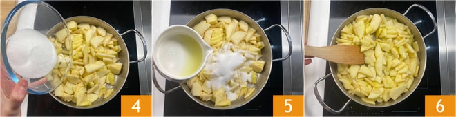 Ajoutez le sucre 4, le jus de citron vert 5 et mélangez 6. Faites cuire à feu moyen-doux, en remuant fréquemment, pendant 10 minutes. Un sirop va se former et s'épaissir peu à peu en se caramélisant, tandis que les pommes se décomposeront et prendront la consistance d'une compote. Une fois prête, laissez refroidir complètement.