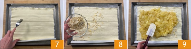 Sur une plaque recouverte de papier sulfurisé, déposez la pâte feuilletée et piquez-la avec les dents d'une fourchette 7. Répartissez sur la surface les amandes effilées 8 qui enrichiront la garniture et protègeront en partie la pâte de l'humidité de la garniture. Versez la compote de pommes 9 et étalez-la sur toute la surface à 2 cm des bords.