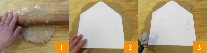 Pour créer, cuire et assembler la maison : pour créer la maison, la cuire et l'assembler, vous avez besoin des gabarits pour découper la pâte. Pour la façade et l'arrière, vous pouvez découper une feuille blanche de 21 cm de large et 26 cm de haut, avec la hauteur qui inclut également le toit ; pour les murs latéraux, il faudra un rectangle de papier de 19 cm de longueur et 15,5 cm de hauteur ; pour le toit, une feuille rectangulaire de 19 cm de longueur et 14,5 cm de hauteur. Pour la porte, il faut un rectangle de 11 cm de hauteur et 8 cm de largeur, pour les fenêtres, vous pouvez utiliser un emporte-pièce de 4 cm de côté. Reprenez la pâte, divisez-la en 6 parties et étalez-en une à la fois en un disque d'une épaisseur d'environ 1,5 cm et des dimensions suffisantes pour la partie de la maison à réaliser (vous pouvez conserver entre-temps celles qui restent à étaler enveloppées dans du film plastique et au réfrigérateur) 1. Commencez par la façade et l'arrière : placez le gabarit sur la pâte étalée 2 et avec une roulette à pâte, découpez la forme 3 ; procédez de la même manière pour l'arrière.