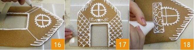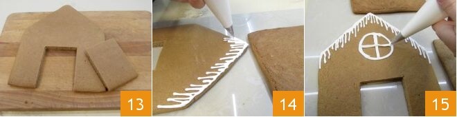 et détachez-la délicatement 13. À ce moment, commencez à décorer la façade avec le glaçage royal comme vous le préférez, en suivant le bord du toit et en simulant la neige qui fond 14 ; réalisez également une fenêtre centrale 15.