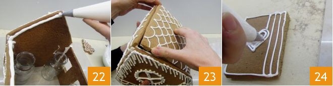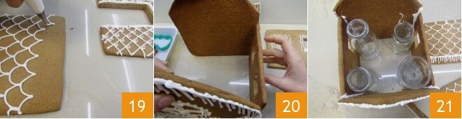 et le toit, en dessinant avec le glaçage royal les tuiles 19. Ensuite, répartissez abondamment le glaçage royal sur les côtés découpés de la façade et des murs, là où ils doivent s'emboîter pour construire la structure de la maison (il est conseillé de monter la maison à au moins deux personnes à cette étape d'assemblage) : ajustez-les pour qu'ils s'emboîtent 20 et une fois montés, insérez des bouteilles ou des pots en verre remplis d'eau à l'intérieur en les positionnant aux coins pour éviter que les murs ne s'effondrent à l'intérieur 21. Le glaçage en se solidifiant servira de colle entre les différentes parties : pour qu'il se solidifie, laissez passer 1-2 heures.