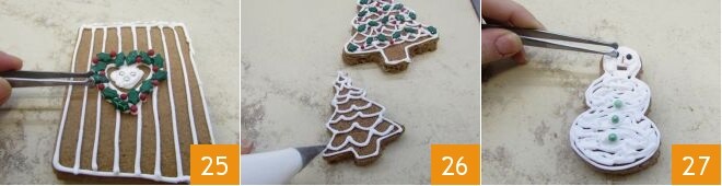 et avec les bonbons décorés, vous pouvez créer une couronne en forme de cœur 25. Maintenant, vous pouvez vous consacrer aux autres décorations : libérez votre imagination et décorez les petits arbres et le bonhomme de neige avec le glaçage royal et les bonbons (26-27). En disposant le croquant autour de la maison, vous pourrez recréer l'enclos et avec le nougat, réaliser le chemin pour arriver à la porte. Avec les chocolats cremini, vous pouvez faire la base d'un banc, réalisé avec des feuilles de chocolat et réaliser également la cheminée. Ensuite, vous pouvez affiner encore les décorations du toit, avec des pointes de glaçage royal et des smarties colorés. Votre maison est prête à être admirée par vos invités pendant toute la période des fêtes !