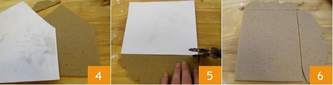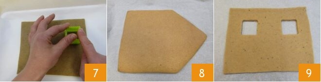procédez de la même manière pour l'arrière 4. Passez ensuite aux murs latéraux, avec le gabarit rectangulaire plus grand (5-6) : réalisez-en deux. Enfin, avec les deux dernières pâtes, réalisez le toit en procédant avec les gabarits de 19x14,5 cm 6.