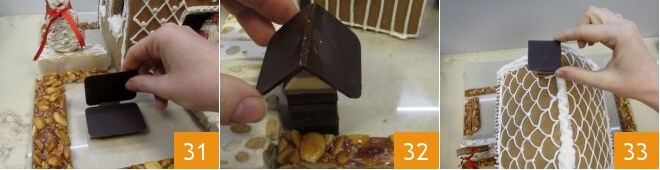 Piquez un morceau de nougat avec un cure-dent pour planter le bonhomme de neige 28 ; placez la porte sur la maison et disposez l'enclos de croquant tout autour de la maison, en laissant de la place à l'intérieur pour les autres décorations 29 ; ensuite, placez des chocolats cremini et appliquez un peu de glaçage royal 30