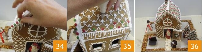 Ensuite, vous pouvez affiner encore les décorations du toit et de la façade, avec des pointes de glaçage royal et des smarties colorés (34-35). Votre maison en pain d'épices sera certainement un chef-d'œuvre à montrer et à déguster avec vos invités 36 !