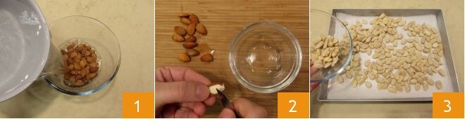 Pour préparer l'enclos, préparez le croquant aux amandes : faites tremper les amandes dans l'eau chaude pendant quelques minutes 1 : cela facilitera l'épluchage : séchez-les avant de les peler et enlevez la peau extérieure à l'aide de la pointe d'un couteau 2. Recouvrez une plaque à pâtisserie de papier sulfurisé, répartissez-y les amandes épluchées 3 et faites-les griller pendant 5 minutes dans un four statique préchauffé à 180° 3. Les amandes ne doivent pas brunir.