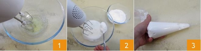 Préparez le Glaçage royal qui vous servira pour la décoration de la maison et des autres éléments. Versez les blancs d'œufs dans un bol avec quelques gouttes de citron : cela aidera à les monter. Activez les fouets 1 et quand le blanc d'œuf est bien monté, versez dans le bol peu à peu le sucre glace tamisé préalablement 2. Continuez à travailler le glaçage avec les fouets jusqu'à ce que le sucre glace soit complètement incorporé et que vous obteniez un glaçage homogène et sans grumeaux. Transférez le glaçage royal dans deux poches à douille : une plus grande avec un embout lisse servira à maintenir ensemble les parties de la maison et une poche à douille plus petite pour les petites décorations 3. Coupez les embouts créant un petit trou seulement au moment d'utiliser le glaçage.