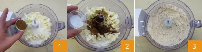 Pour préparer la maison en pain d'épices, commencez par la pâte : dans le bol d'un mixeur, versez la farine tamisée, le sucre en poudre, le beurre froid du réfrigérateur en morceaux, et toutes les épices en poudre : la cannelle 1, le gingembre, la noix de muscade, les clous de girofle. Ensuite, ajoutez le bicarbonate et le sel 2. Activez les lames et réalisez le sablage 3,