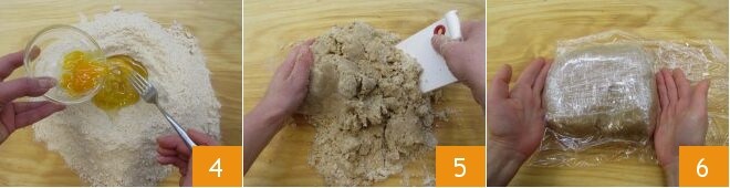 puis renversez-la sur le plan de travail et créez la forme classique de fontaine : versez au centre le miel et les œufs avec le jaune 4 ; mélangez d'abord avec une fourchette puis pétrissez à la main sans chauffer trop la pâte 5, juste le temps de former un mélange compact. Formez une boule, aplatissez-la légèrement et enveloppez-la dans du film plastique 6. Laissez reposer au réfrigérateur pendant au moins 30 minutes.