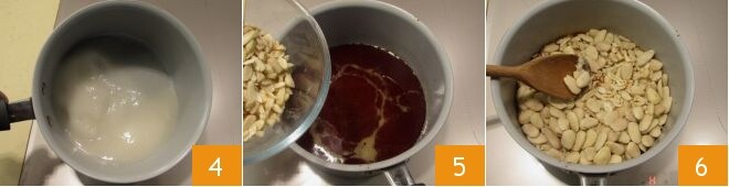 Placez une feuille de papier sulfurisé (ou de cuisson) sur une plaque : elle vous servira ensuite à refroidir le croquant aux amandes (si vous en avez, vous pouvez utiliser un tapis en silicone). Dans une casserole, versez le sucre, le jus de citron et l'eau 4. Faites fondre à feu doux en remuant constamment, jusqu'à obtenir un mélange d'une belle couleur blonde. Entre-temps, hachez grossièrement une partie des amandes en laissant entières les restantes. Une fois le caramel prêt, éteignez le feu et versez dans la casserole les amandes hachées et celles entières 5. Mélangez vigoureusement les amandes avec une cuillère en bois 6 et incorporez le tout.