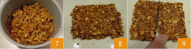 Quand le mélange est prêt 7, versez-le encore chaud sur un tapis en silicone 8 ou sur une plaque recouverte de papier sulfurisé et nivelez la surface. Laissez le croquant tiédir, mais avant qu'il ne solidifie complètement, retournez-le sur une planche à découper et coupez-le en losanges d'environ 2 cm d'épaisseur 9.