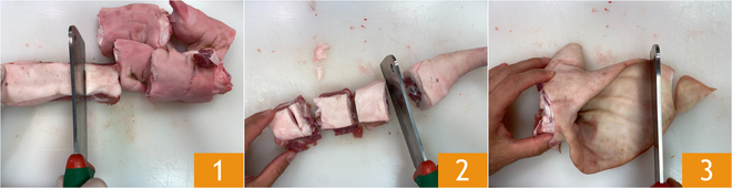 Pour préparer la cassoeula revisitée avec polenta, commencez par couper en morceaux plus petits le pied 1, la queue 2 et l'oreille 3.