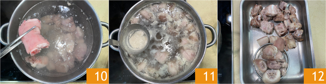 Plongez les autres parties du porc dans de l'eau bouillante 10 et faites cuire pendant environ 20 minutes, en enlevant de temps en temps la mousse en surface 11. Une fois ce temps écoulé, égouttez le tout et ajoutez-le aux côtes dans la plaque 12. Gardez au chaud.