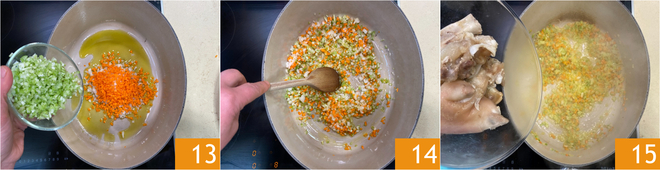 Chauffez un bon filet d'huile dans une grande casserole, puis ajoutez l'oignon, la carotte et le céleri finement hachés 13 et laissez doucement revenir 14. Quand le sofrito est attendri, ajoutez les morceaux de couenne et de pied 15.