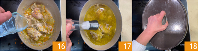Couvrez d'eau froide 16, salez 17 et poivrez. Fermez avec le couvercle 18 et faites cuire à feu doux pendant environ 40 minutes.