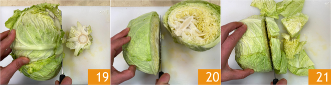 Entre-temps, occupez-vous du chou frisé : éliminez la base 19, puis divisez-le en deux 20 et coupez-le en gros morceaux, y compris les feuilles extérieures 21.