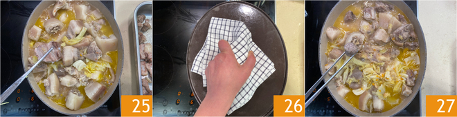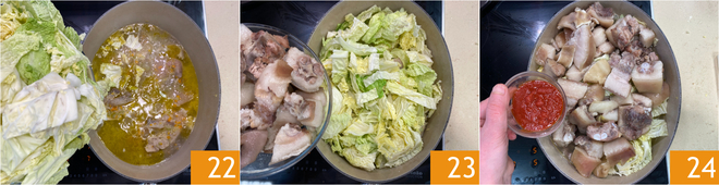 Après les 40 minutes de cuisson, ajoutez le chou frisé dans la casserole 22, puis incorporez les morceaux de museau, d'oreille et de queue 23. Versez également la sauce tomate 24 et poursuivez la cuisson pendant encore 15 minutes, toujours avec le couvercle.