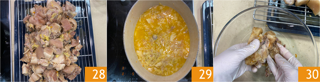 Transférez les morceaux de viande sur une grille pour faire égoutter le liquide en excès et laissez tiédir 28. Entre-temps, réduisez le fond de cuisson avec les choux à feu doux pendant environ 30 minutes 29, jusqu'à obtenir une sauce dense, brillante et savoureuse. Effilochez la viande à la main pour éliminer les os et rassemblez-la dans un bol 30, avec les autres morceaux de porc.