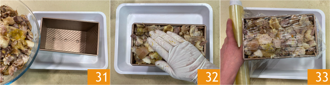 Versez le tout dans une terrine de 20x11x11 cm 31, pressez bien avec la main 32 et couvrez de film alimentaire 33. Placez un poids dessus et laissez reposer au réfrigérateur toute la nuit.