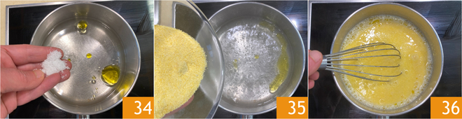 Versez l'eau dans une casserole, ajoutez l'huile et le sel 34 et portez à ébullition. Quand ça commence à bouillir, versez en pluie la farine de maïs 35. Mélangez bien avec un fouet 36 et faites cuire à feu doux pendant environ 45 minutes.