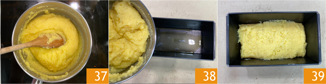Quand la polenta s'est épaissie 37, transférez-la dans une terrine de 20x10x7 cm huilée à l'huile 38. Nivelez la surface 39 et couvrez de film alimentaire. Laissez refroidir d'abord à température ambiante puis au réfrigérateur, avec la terrine de cassoeula.