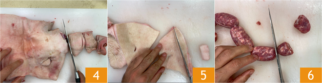 Faites de même avec le museau 4, la couenne 5 et les petits boudins 6. En alternative, vous pouvez demander à votre boucher de confiance de le faire pour vous.