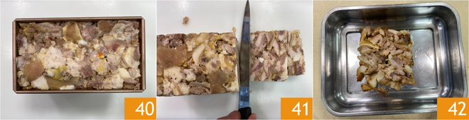Après le temps de refroidissement 40, démoulez la terrine de cassoeula sur une planche et coupez-la en tranches d'environ 2-3 cm d'épaisseur 41. Transférez les tranches dans une plaque 42 et réchauffez-les au four à 200° pendant 20 minutes.