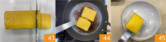 Démoulez également la polenta et coupez-la en tranches 43, puis chauffez-les dans une poêle de chaque côté jusqu'à ce qu'elles soient dorées 44. Vous êtes prêt à dresser : disposez à la base une tranche de polenta croustillante 45.