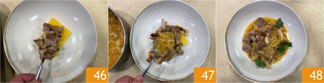 Ajoutez la cassoeula 46 et nappez avec le jus de choux réduit 47. Garnissez avec quelques feuilles de cerfeuil et votre cassoeula revisitée avec polenta est prête à être servie 48 !
