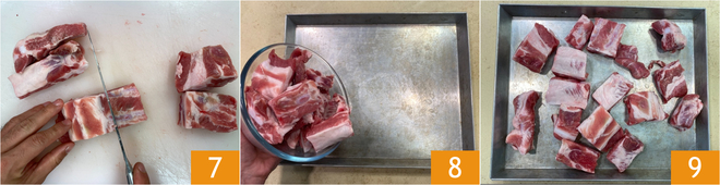 Coupez également les côtes en morceaux 7, répartissez-les sur une plaque 8 et faites cuire au four statique à 140° pour environ 20 minutes 9.
