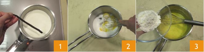 Pour préparer les castagnoles fourrées, commencez par la crème pâtissière qui aura besoin de refroidir. Dans une casserole, chauffez le lait et la crème avec la gousse de vanille coupée et privée de ses graines 1. Vous pouvez utiliser les graines dans le lait ou les ajouter aux jaunes et au sucre à travailler dans une autre casserole avec un fouet à main 2. Ajoutez à ce mélange la maïzena et mélangez encore pour amalgamer 3.