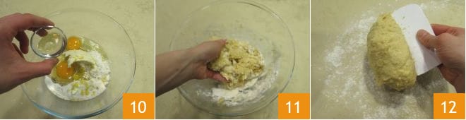 Versez la liqueur d'anis 10 et une pincée de sel. Mélangez le tout d'abord avec une fourchette puis à la main 11. Transférez la pâte sur un plan de travail, farinez légèrement et manipulez avec l'aide d'une corne 12.