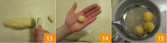 Formez une boule puis un boudin 13, à partir duquel découpez des morceaux d'environ 20 g 14. Donnez une forme ronde à chacun 14, puis faites frire quelques boules à la fois dans de l'huile de graines d'arachide déjà chaude à 140° (à mesurer avec un thermomètre de cuisine) 15, jusqu'à ce qu'elles soient dorées.