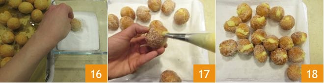 Égouttez-les sur du papier absorbant pour friture afin d'éliminer l'excès d'huile. Encore chaudes, plongez-les dans le sucre semoule 16. Vous pouvez maintenant les remplir avec la crème pâtissière mise dans une poche à douille avec une embout très étroit 17. Servez vos castagnoles fourrées 18 !